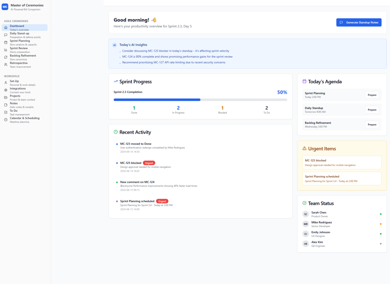 Intelligent Dashboard - A unified view that gives you sprint progress, today's agenda, recent activity, and team status at a glance.