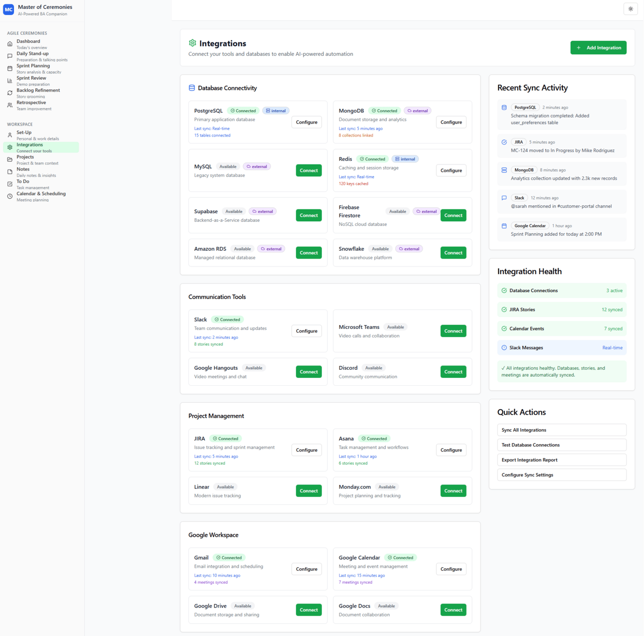 Zero Context Switching - Connect all your existing tools—Slack, JIRA, Asana, Teams, Linear, Google Workspace. The platform pulls ceremony-relevant data from everywhere you already work. Additionally plugin other agents or external data sources / databases.
